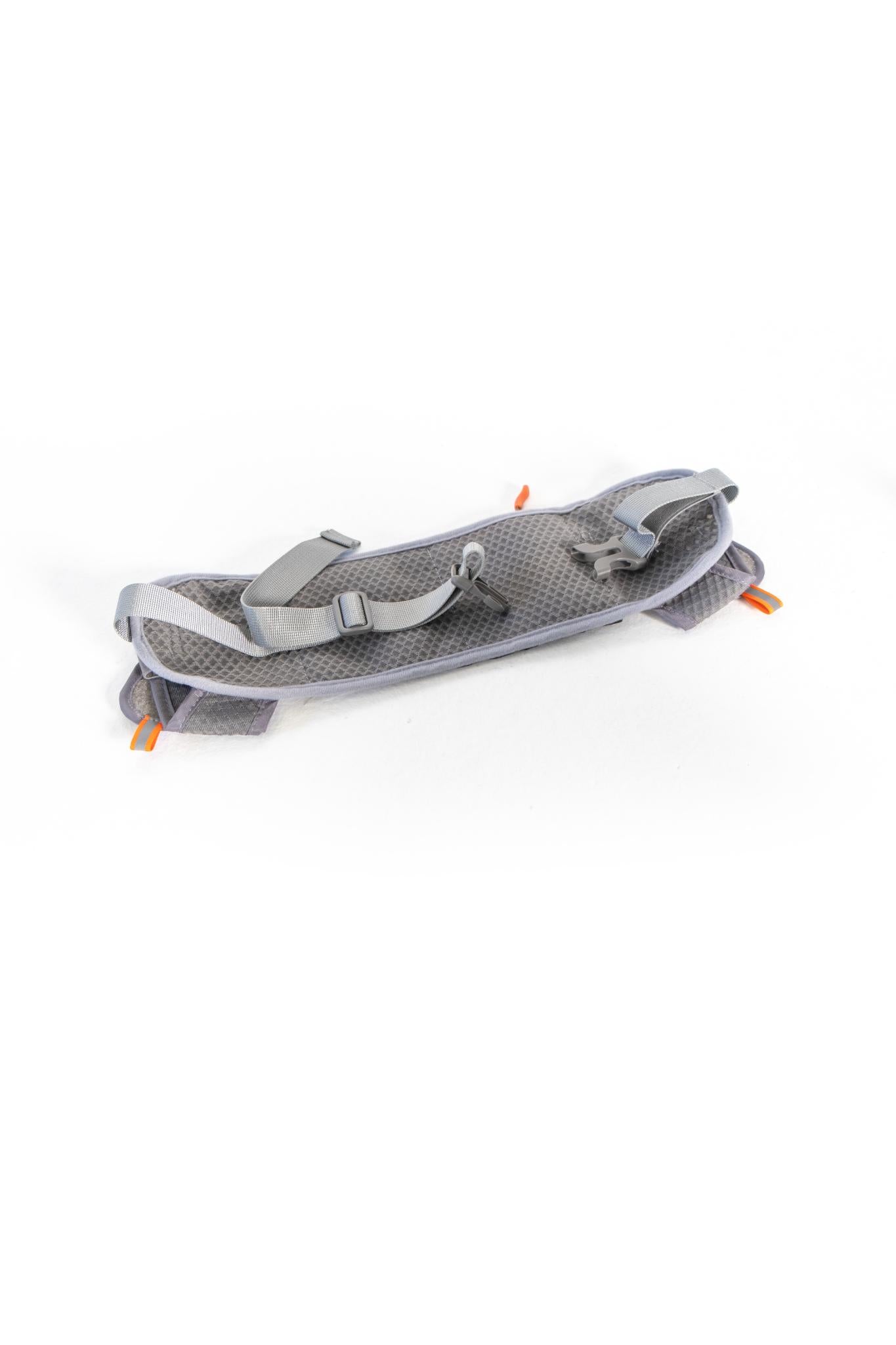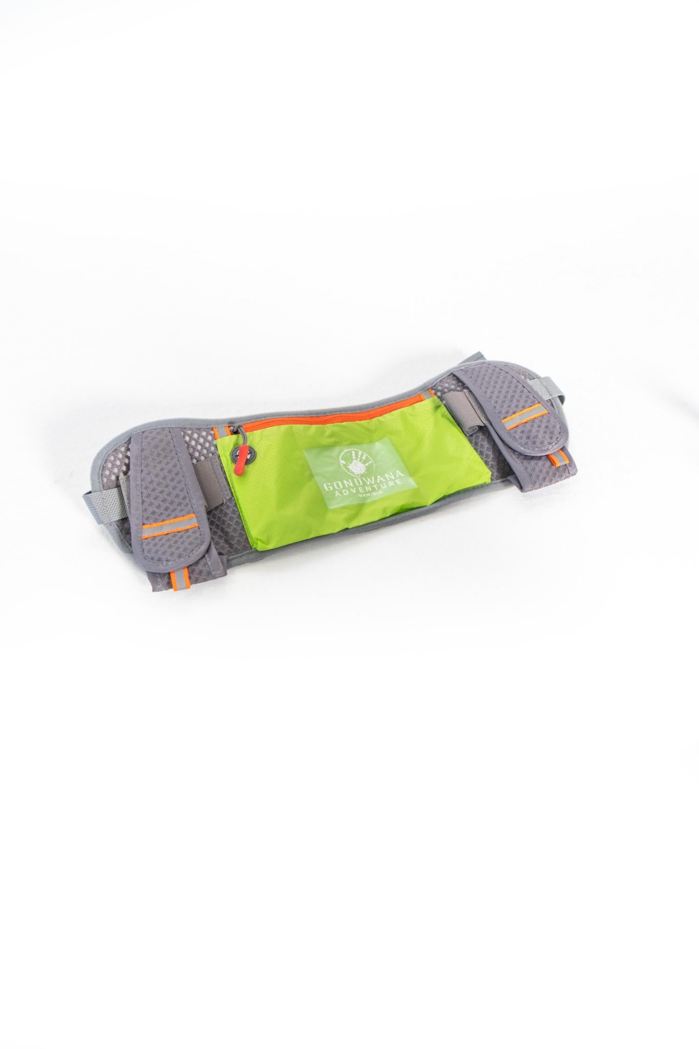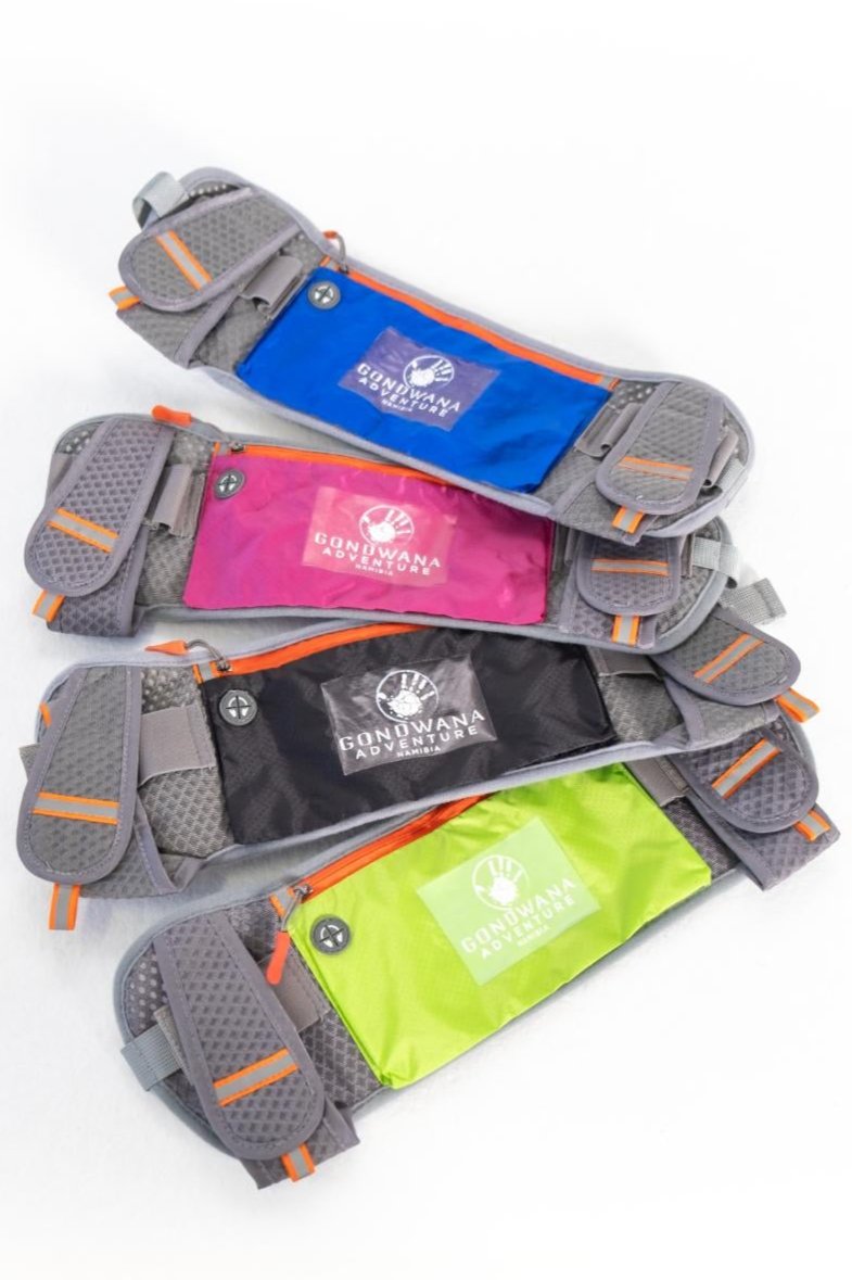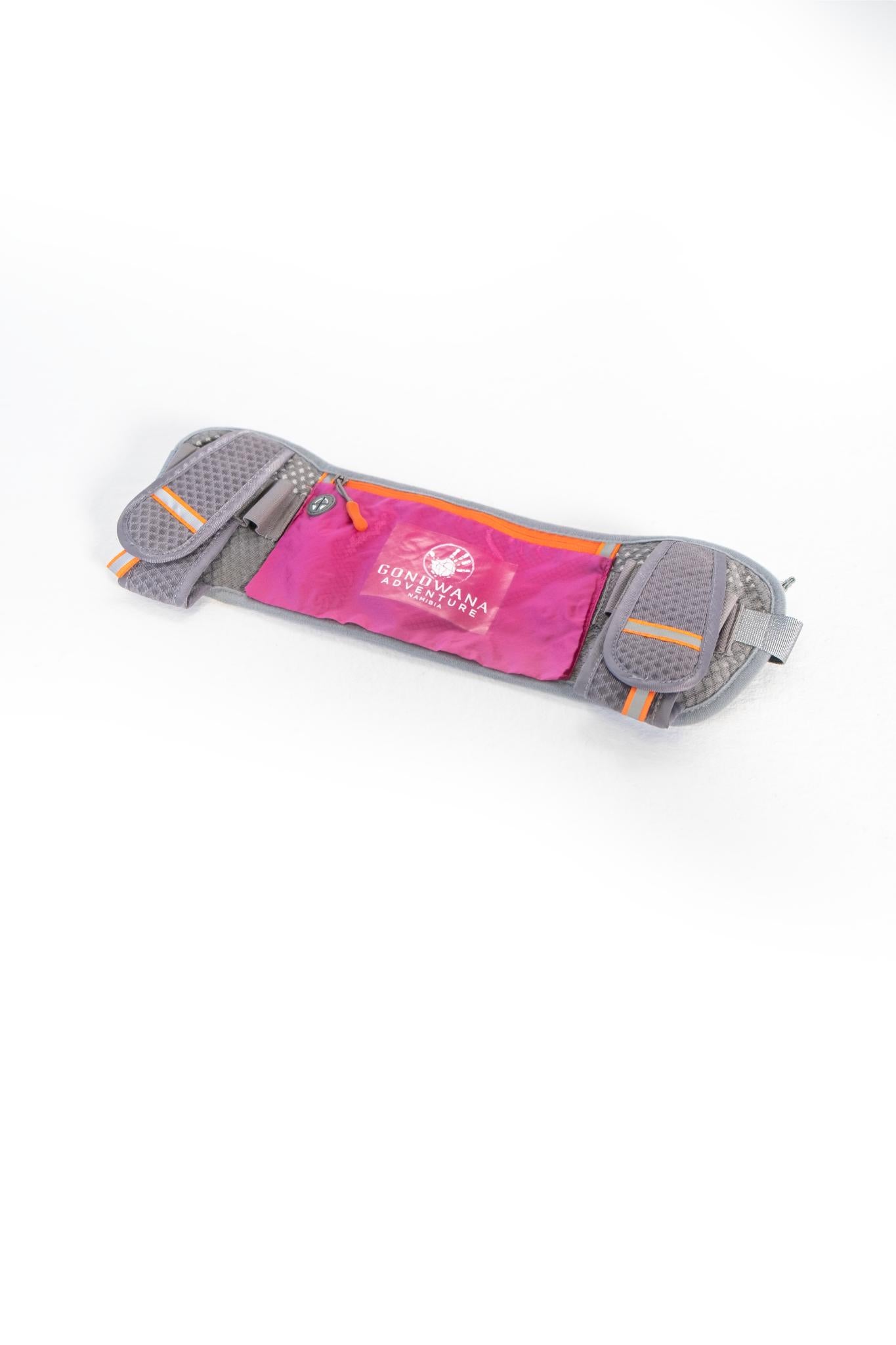 A grey and black/blue/pink/yellow insert unisex waist pack with reflective orange zip elements and a Velcro adjustable bottle space holder in water repellant material for all your belongings