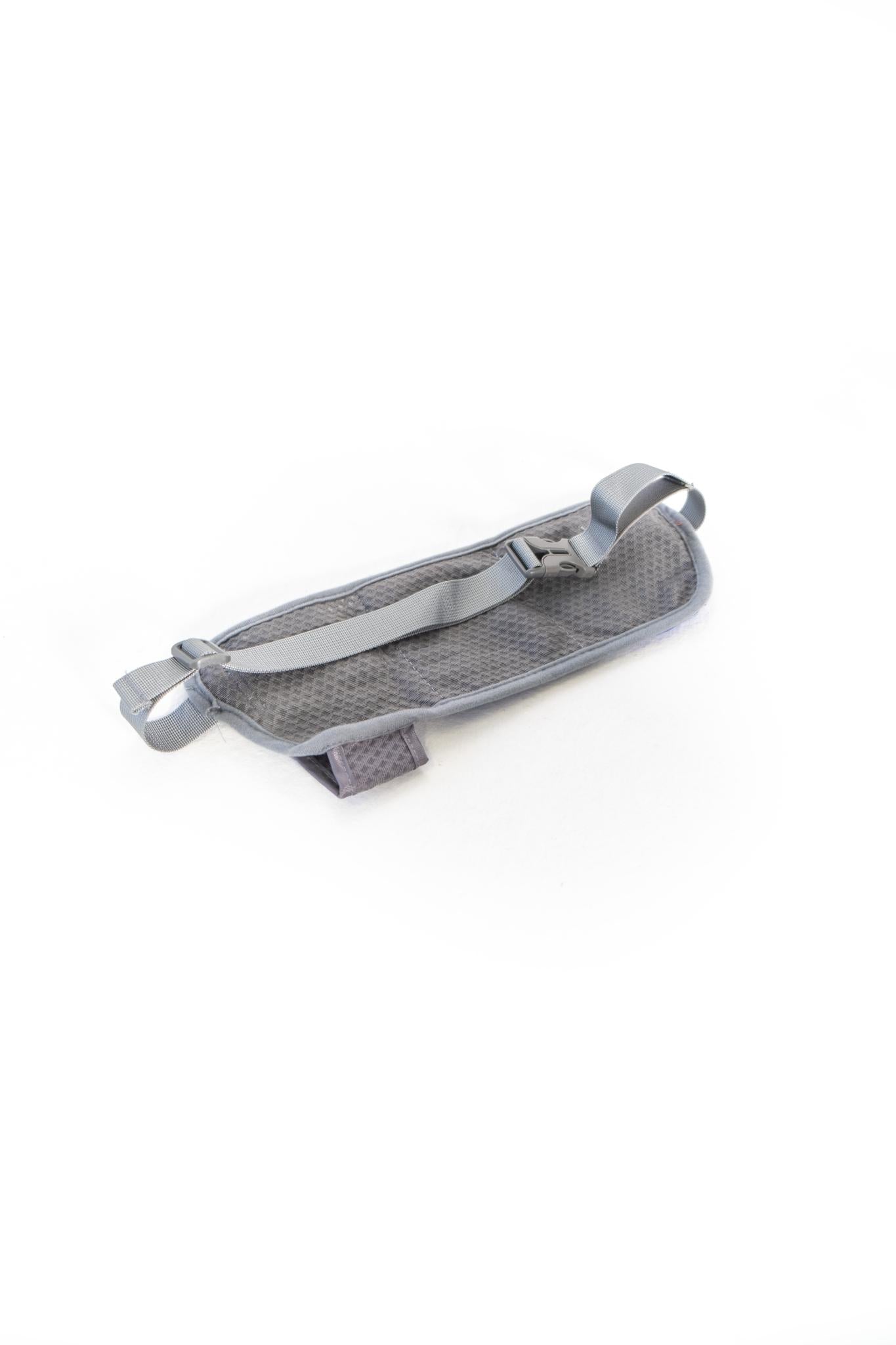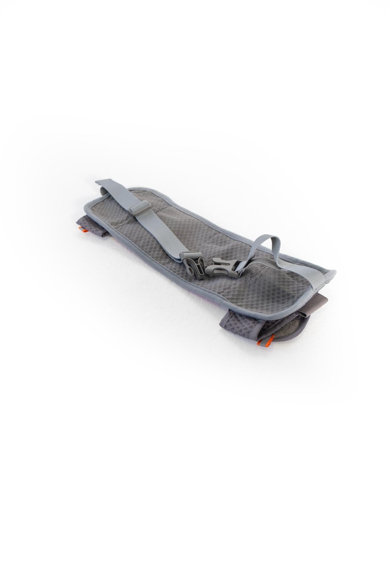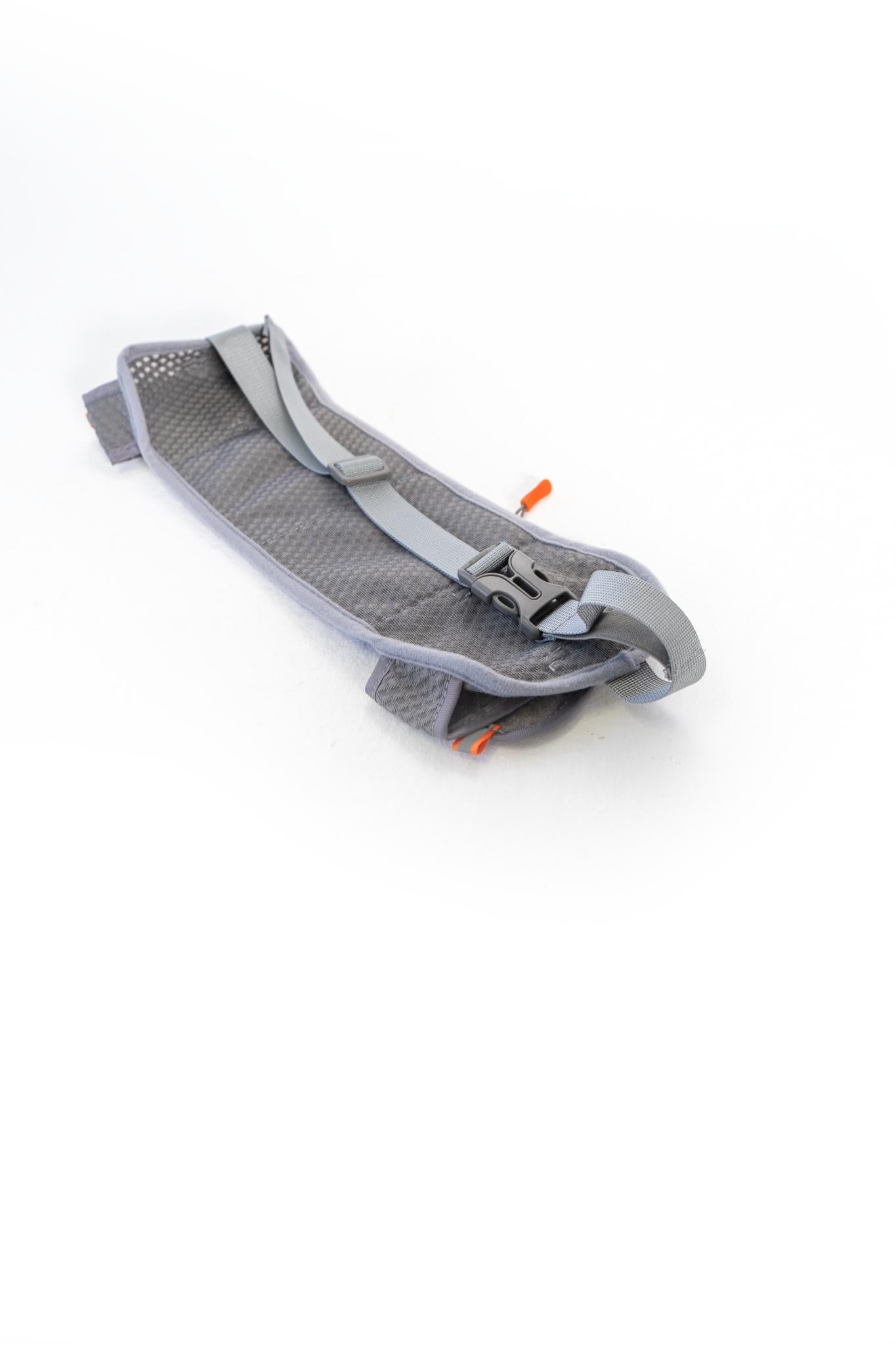 A grey and black/blue/pink/yellow insert unisex waist pack with reflective orange zip elements and a Velcro adjustable bottle space holder in water repellant material for all your belongings