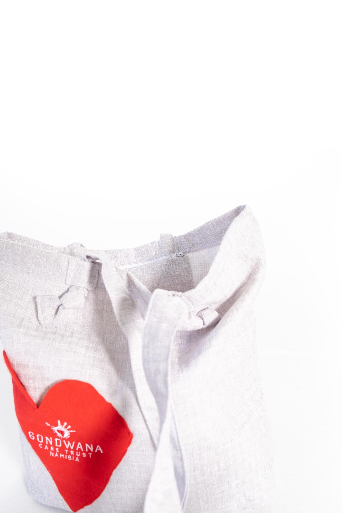 A handmade tote bag made from cotton with an inside zip pocket. On the outside, the handles are easily adjustable by adjusting the knot. A Care Trust heart is applied from felt and left partially open for your keys or parking ticket.