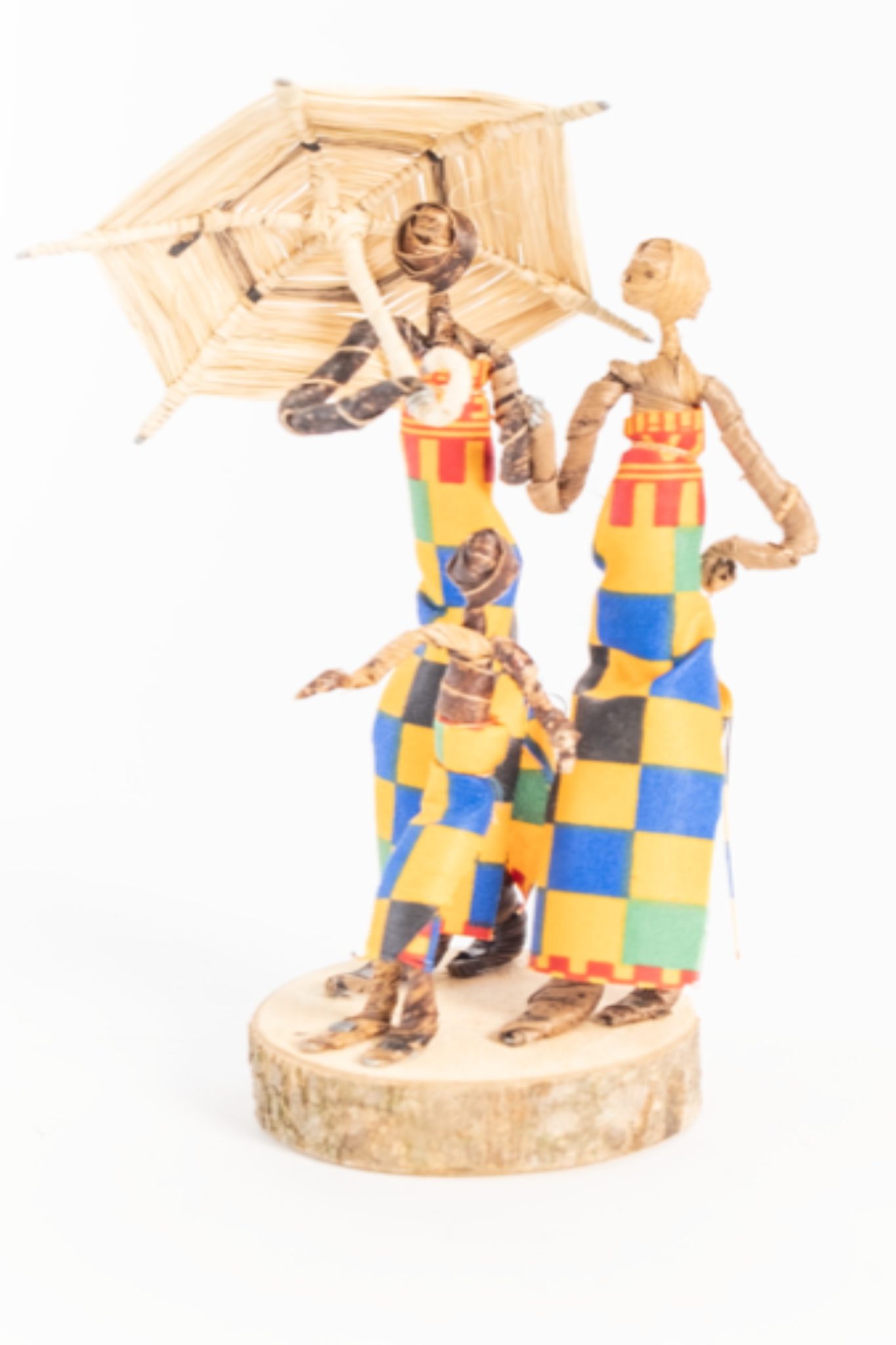 An endearing African family dressed in traditional kitenge cloth under an umbrella shielding from the sun on a wooden base stand