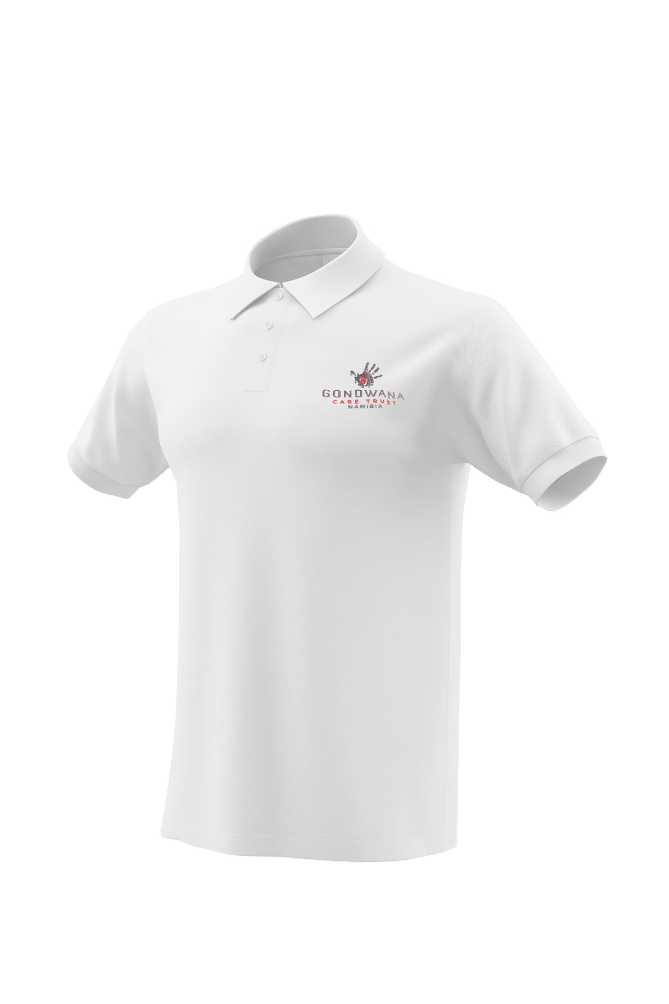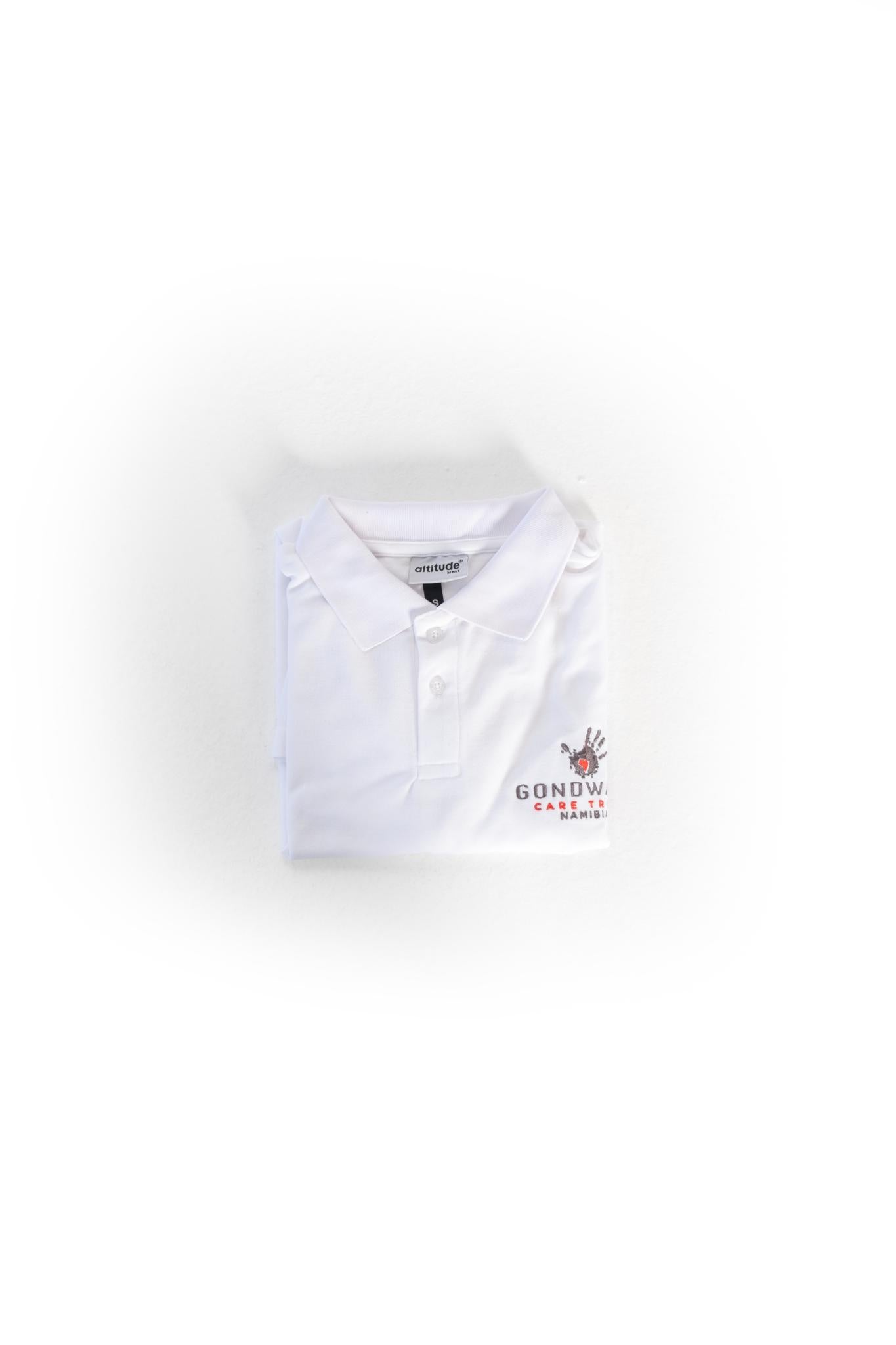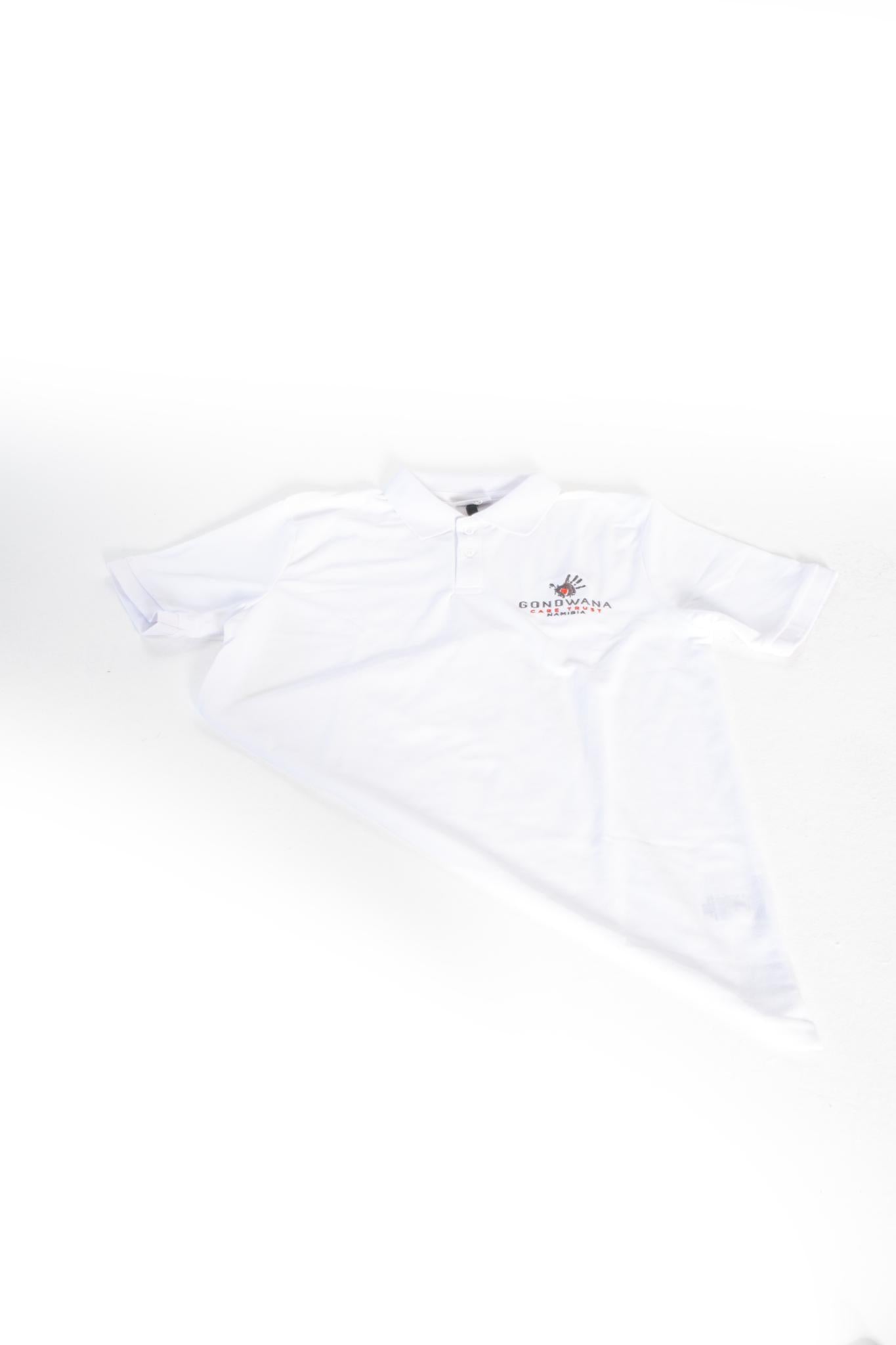 A white Golf shirt made from 100% polyester with color embroidery of the Gondwana Care Trust logo