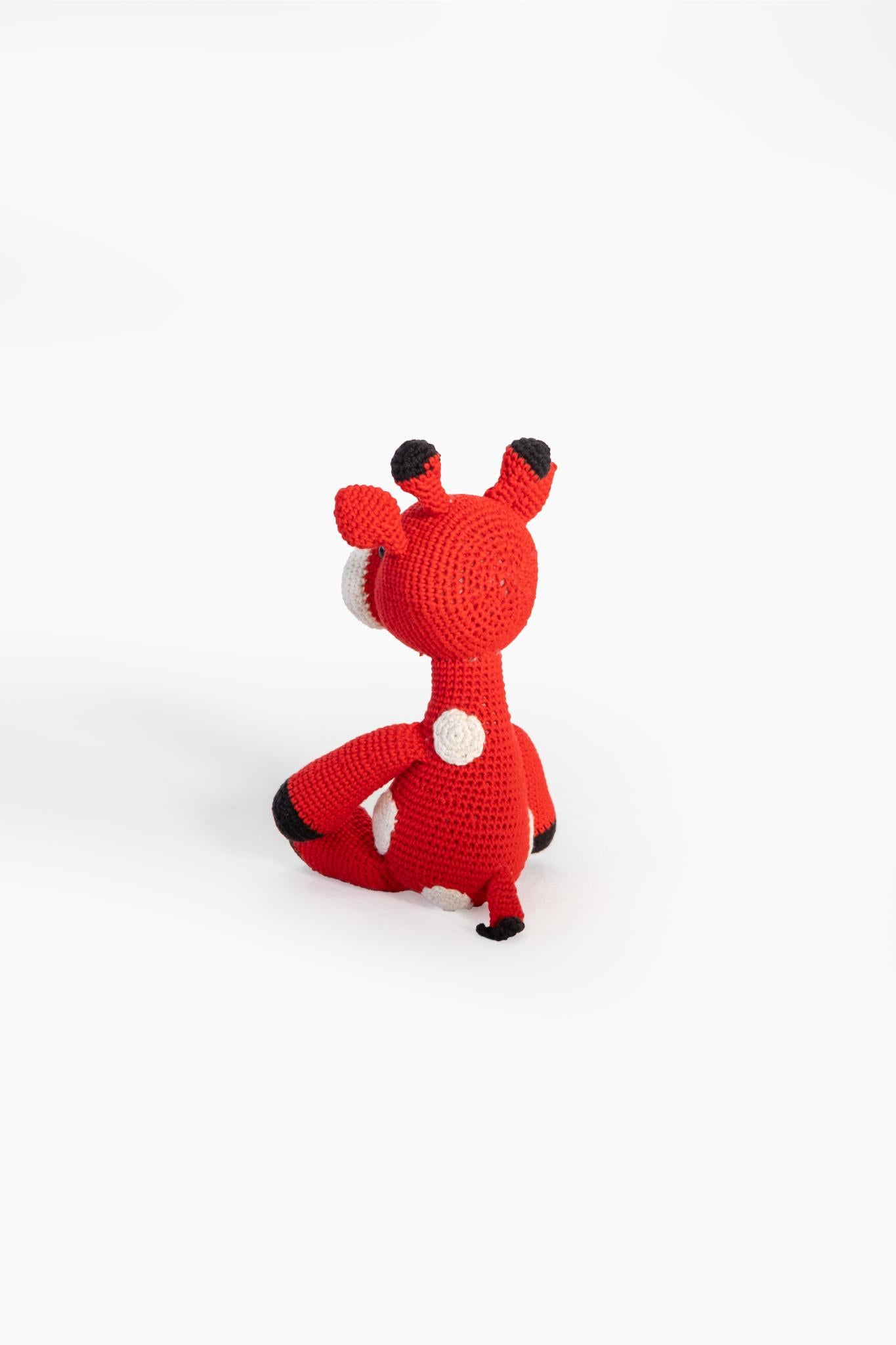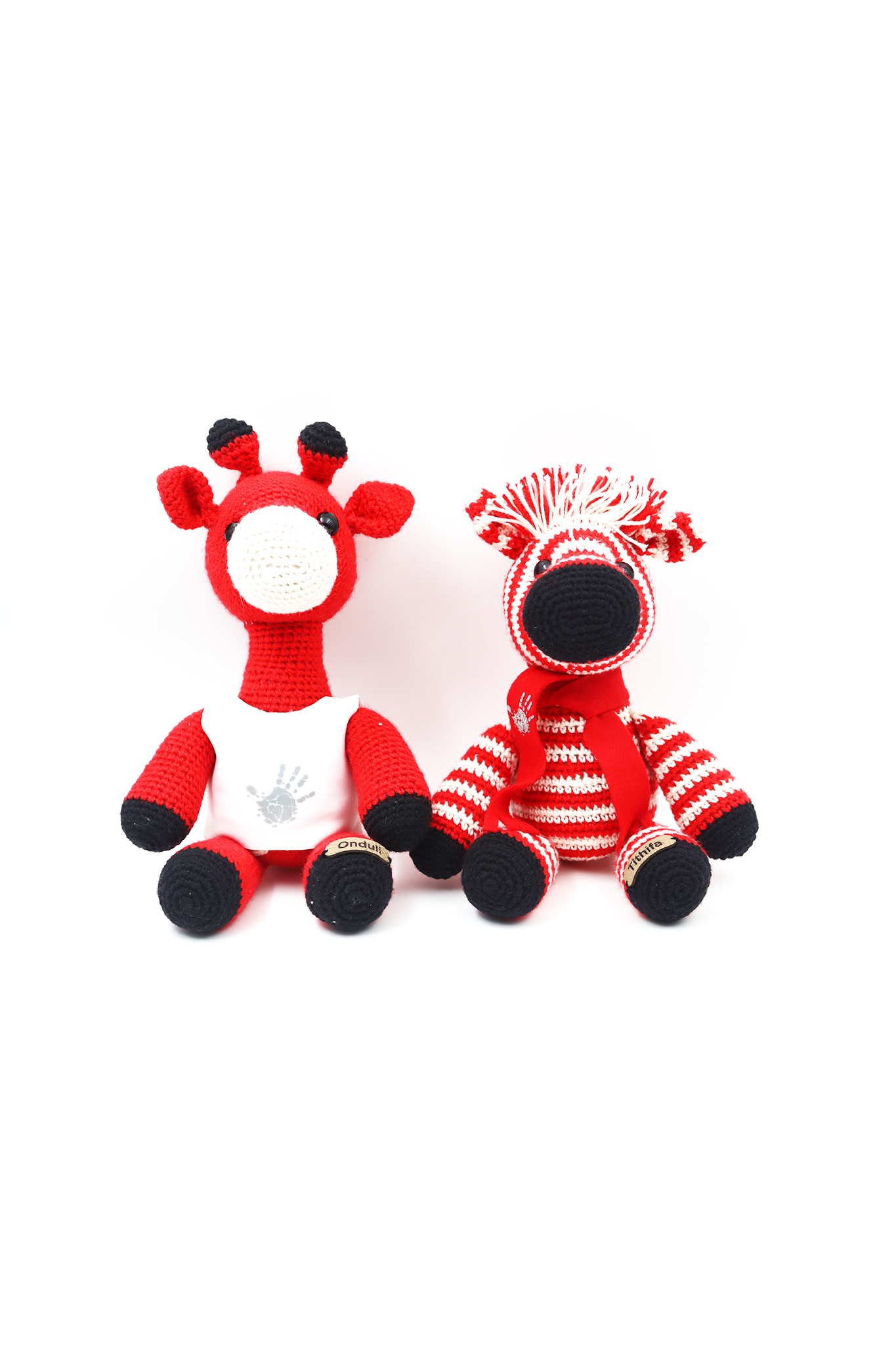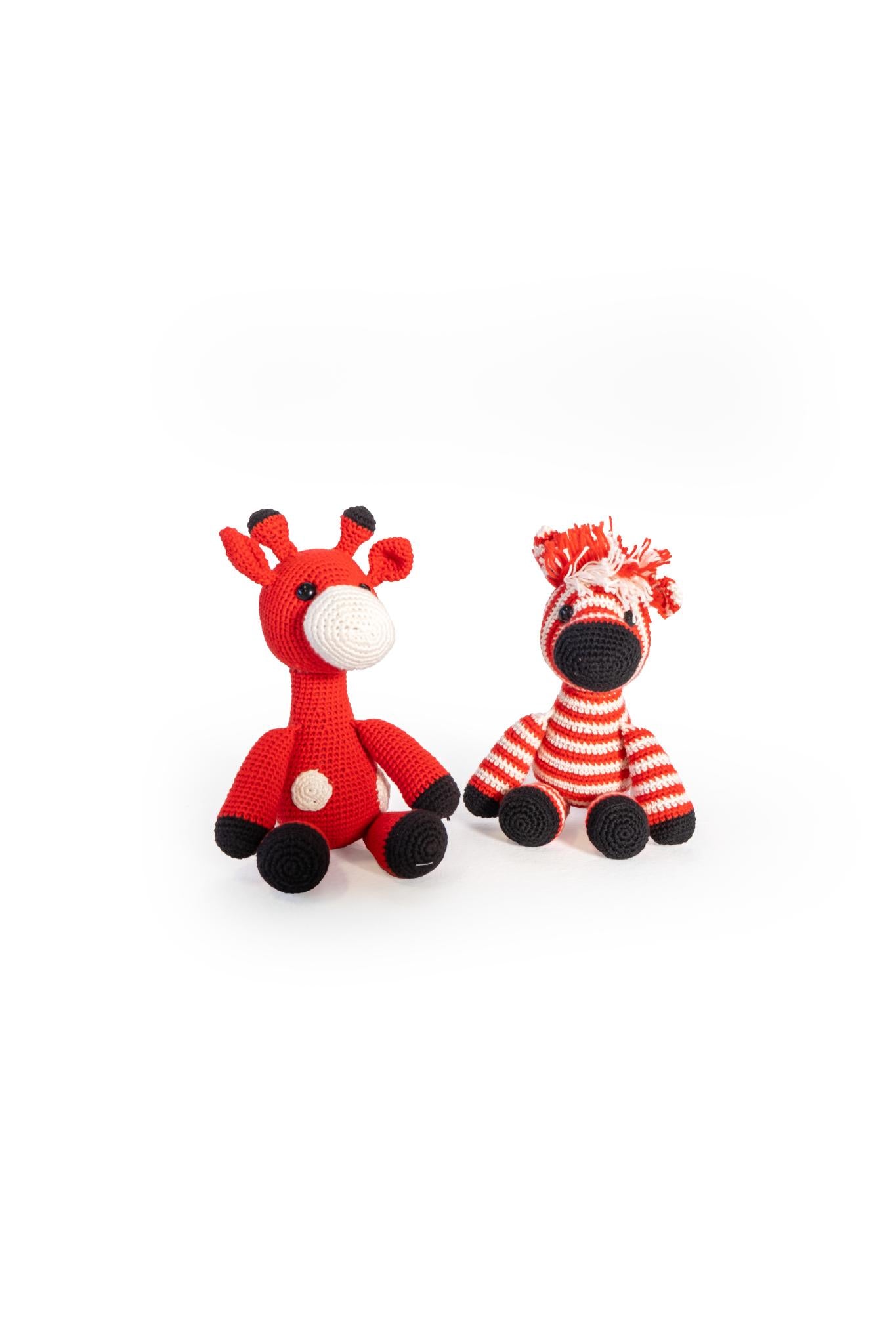 Made from bamboo cotton (white and black wool) and polycotton (red wool), the giraffe wears a white jacket and the zebra a felt scarf. Both animals carry their leather nametag on their leg