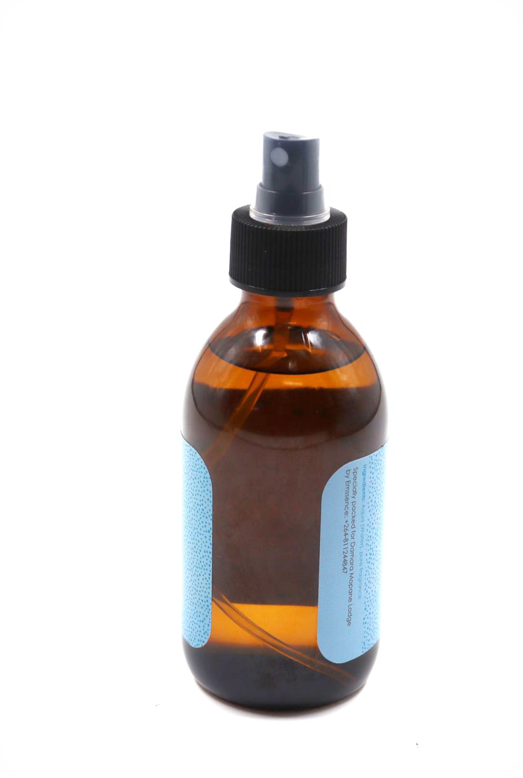 A biodegradable home fragrance spray in an amber glass bottle with a black spray pump with the scent of lemon and truly African mopane leaves