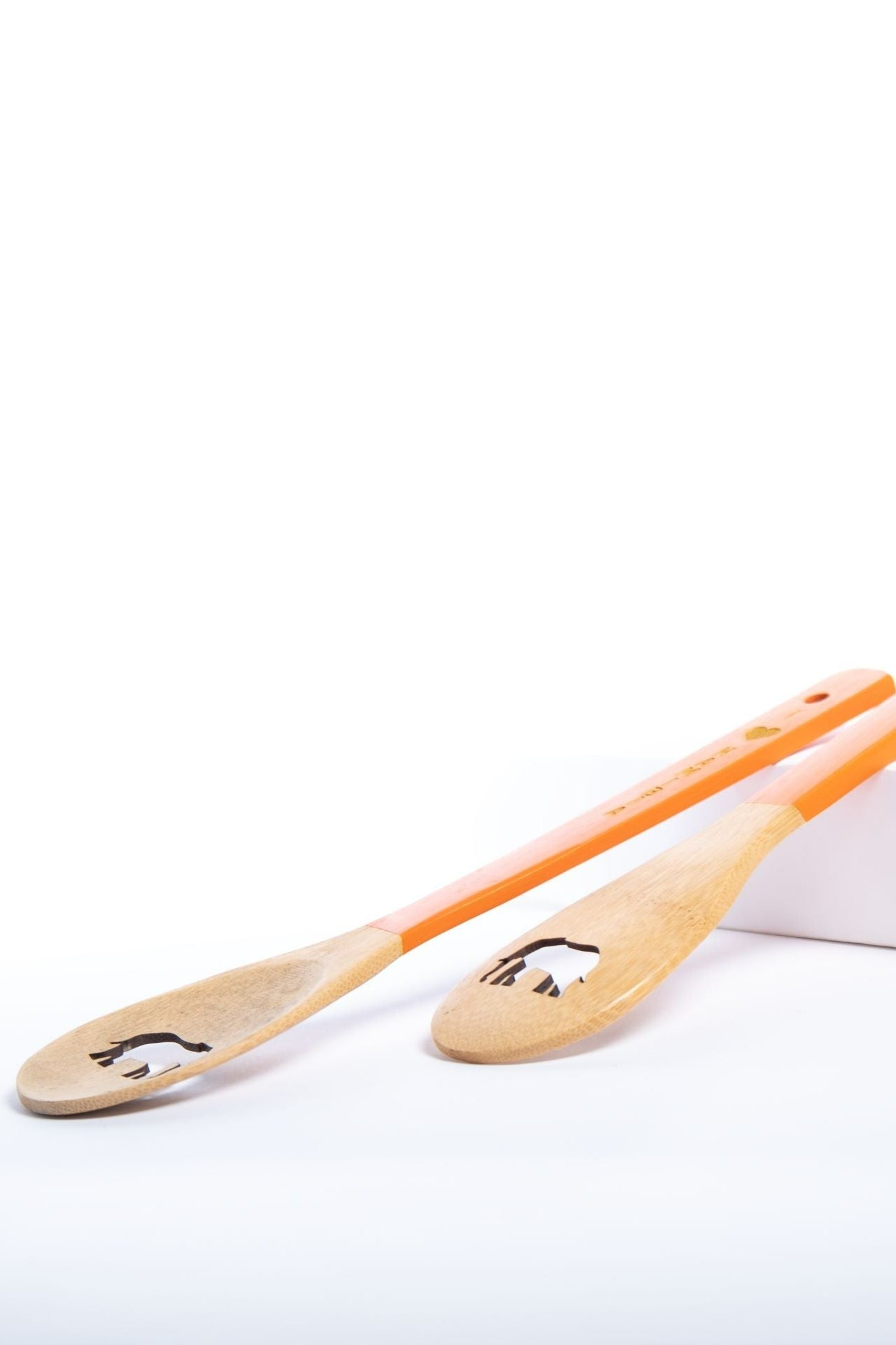 Service à salade contemporain en bois de couleur claire avec lion africain découpé au laser et décoré avec des poignées peintes non toxiques.