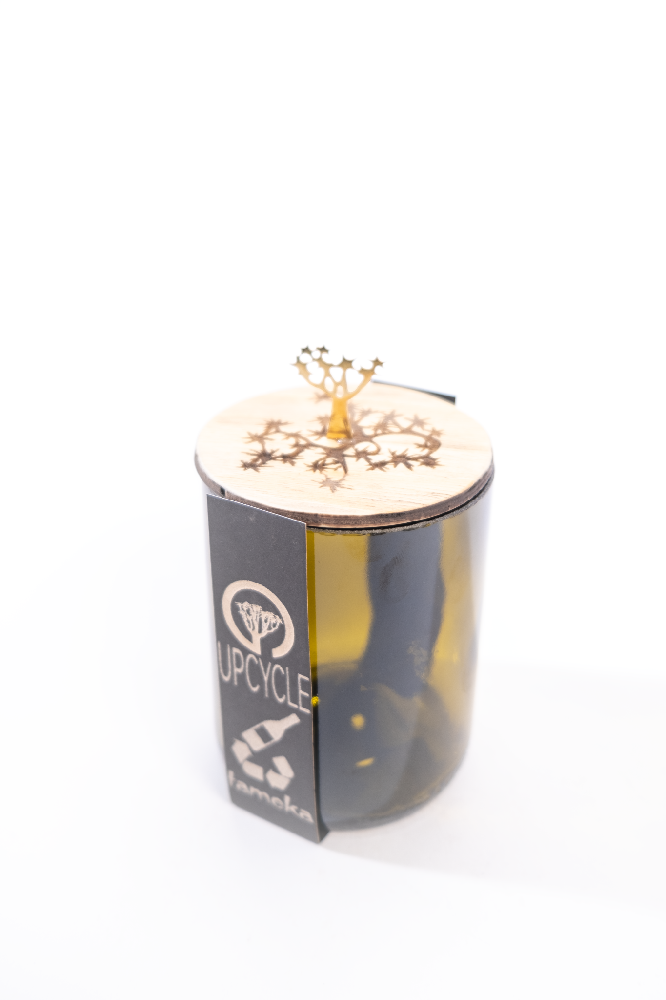 A wine bottle cut in half with a wooden closure and a metal tree adornment