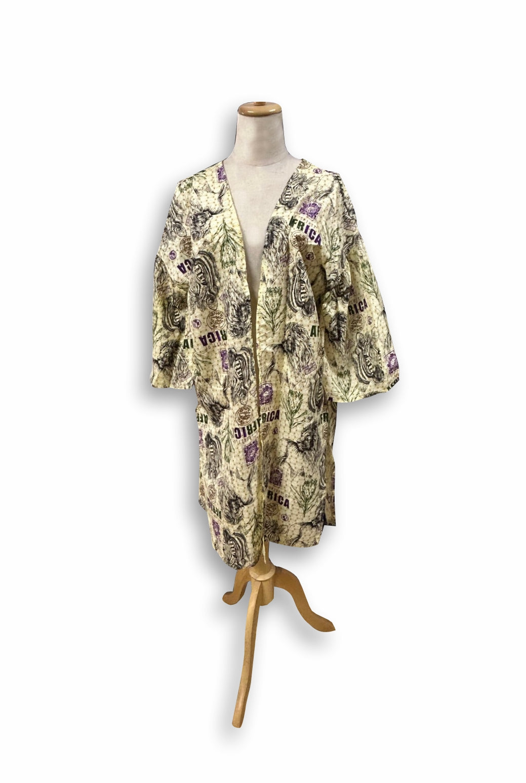 An open kimono made from soft flowing polyester/viscose material with nostalgic print of African animals, stamps and local currencyÂ