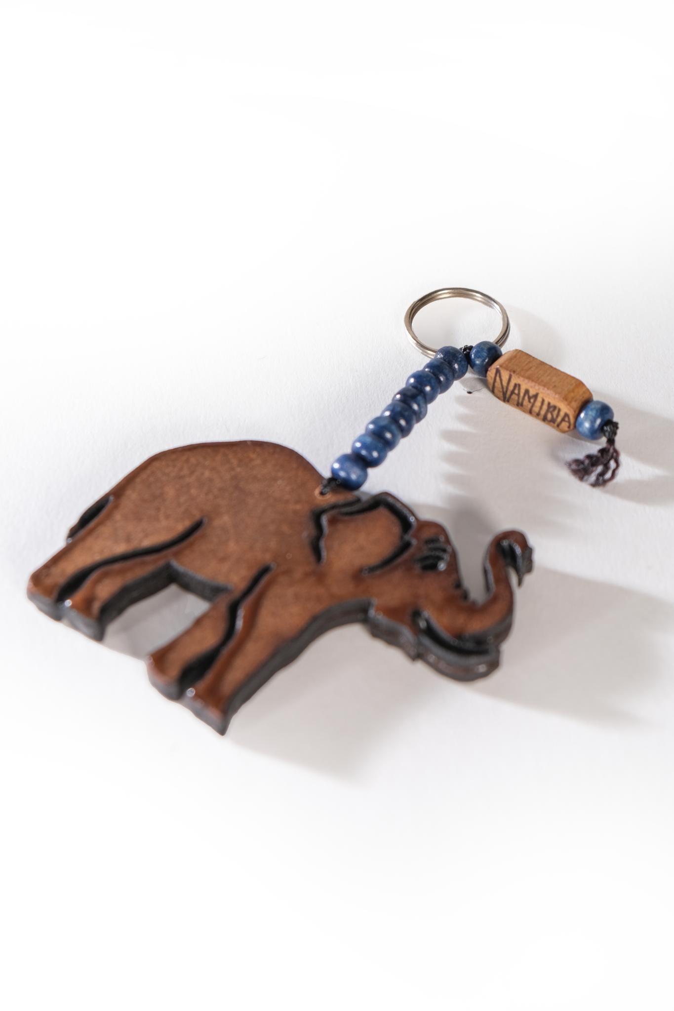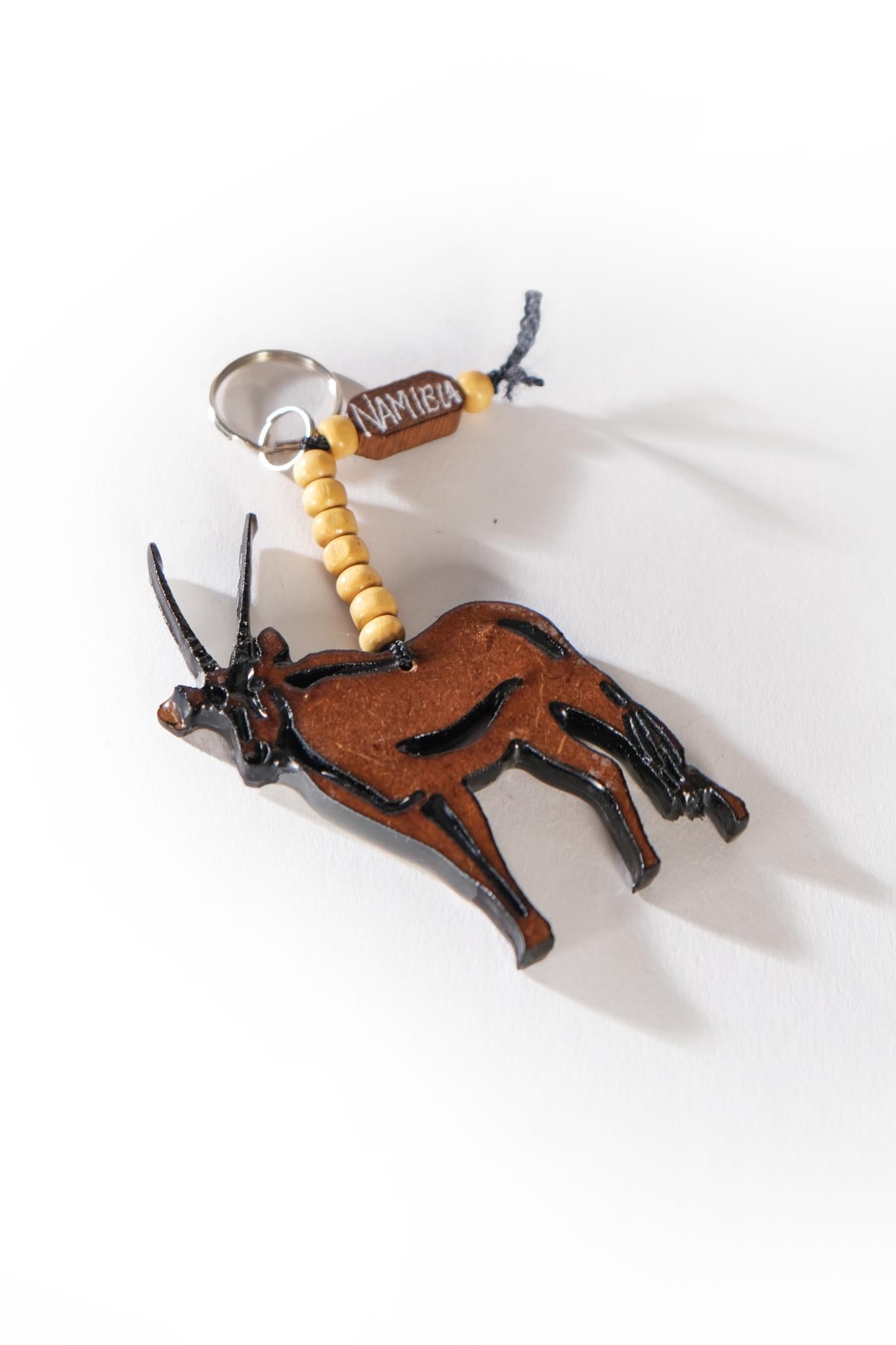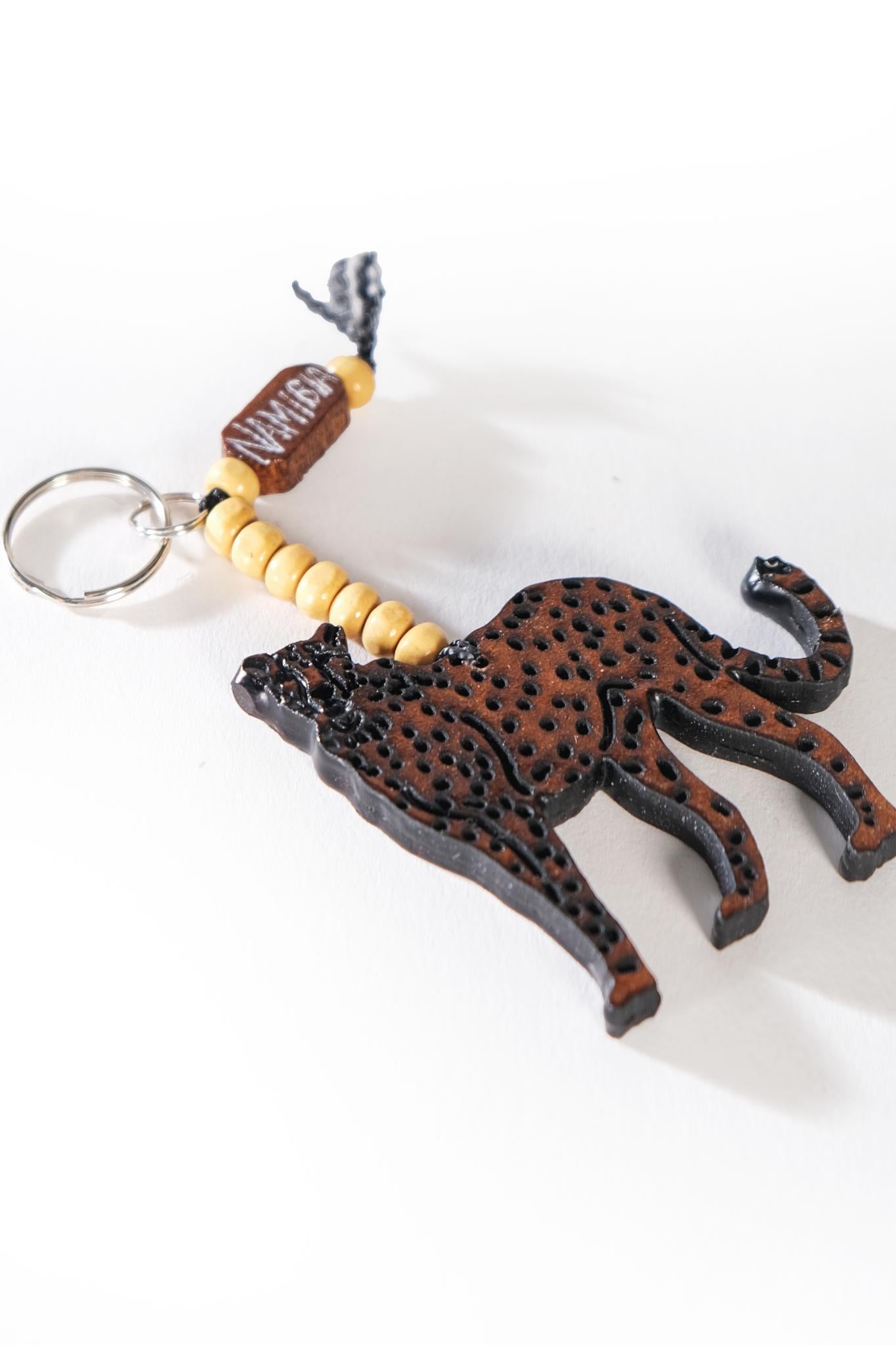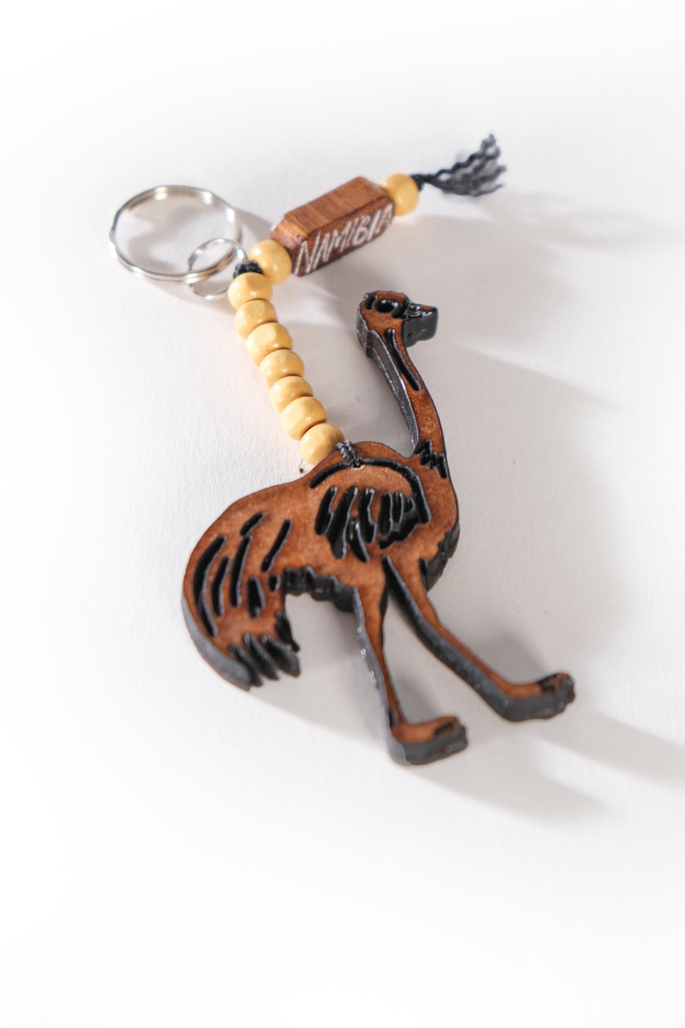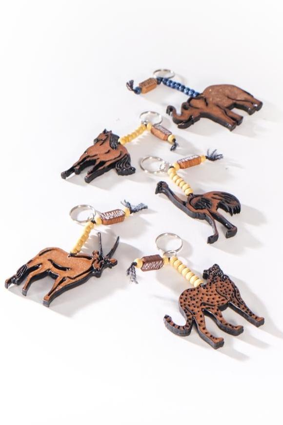 Lasercut varnished wooden animal with string of wooden beads on a keyring and a wooden NAMIBIA tag attached