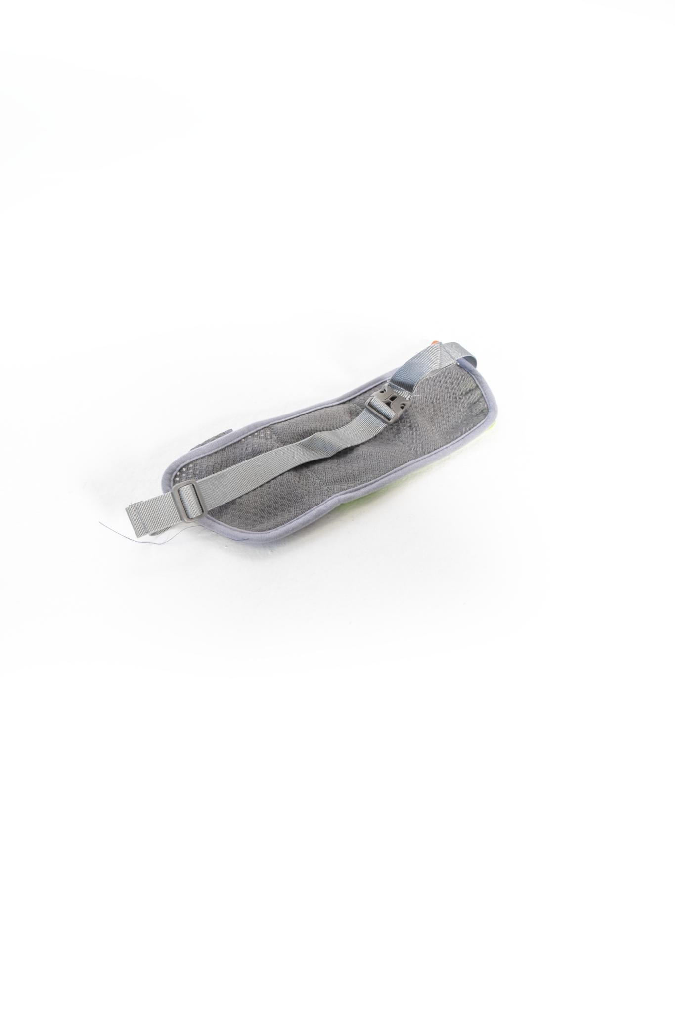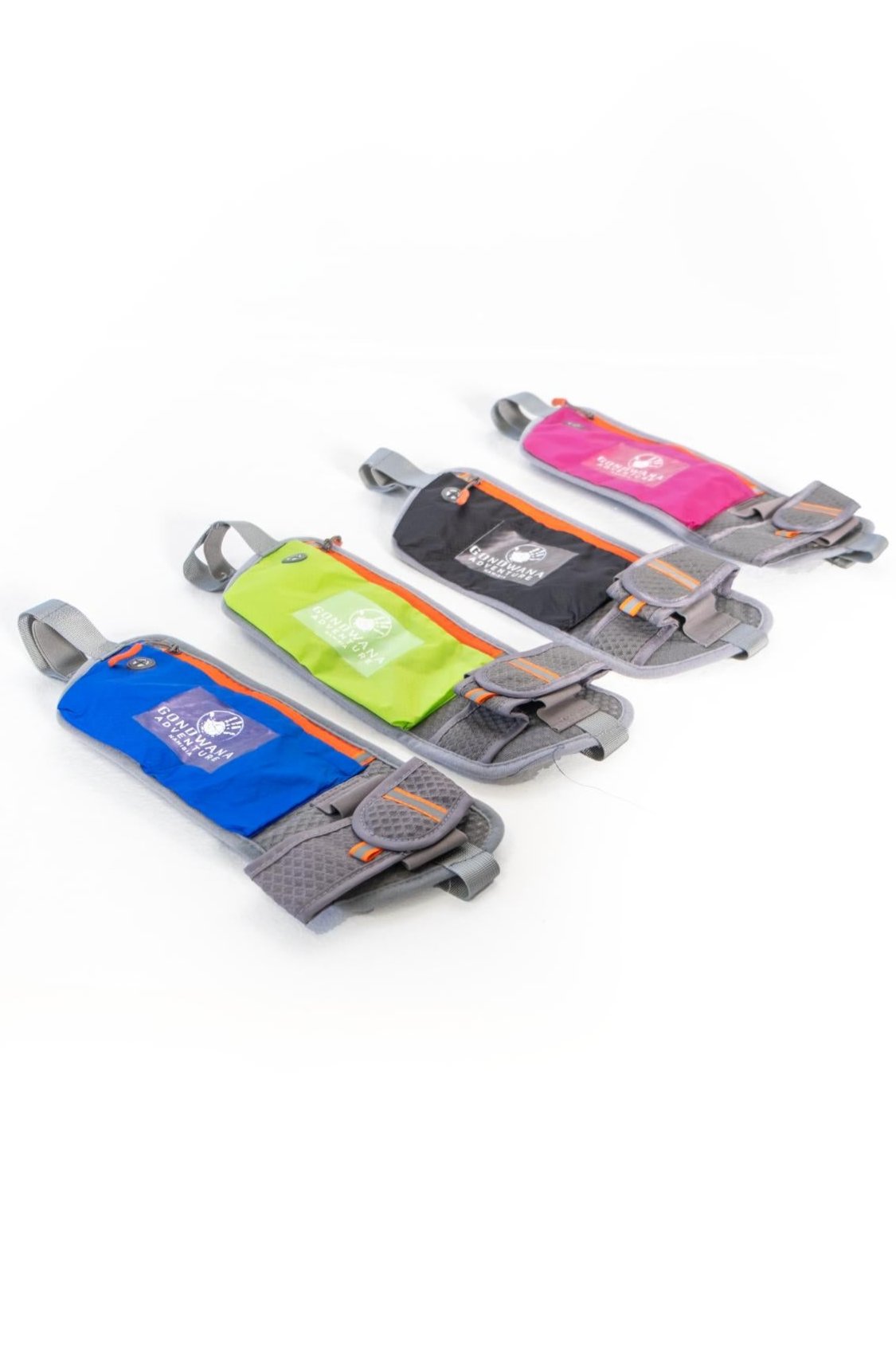 A grey and black/blue/pink/yellow insert unisex waist pack with reflective orange zip elements and a Velcro adjustable bottle space holder in water repellant material for all your belongings