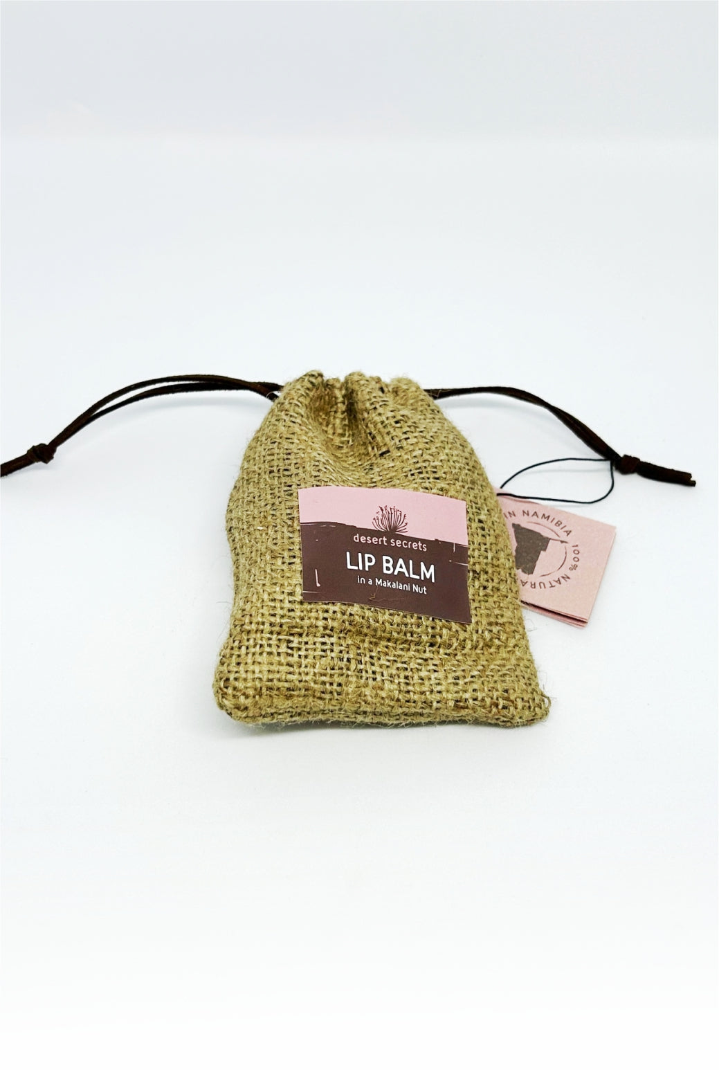 Lipbalm inside a Makalani palm nut container with a lid, wrapped in a hessian giftbag and leather string closure.