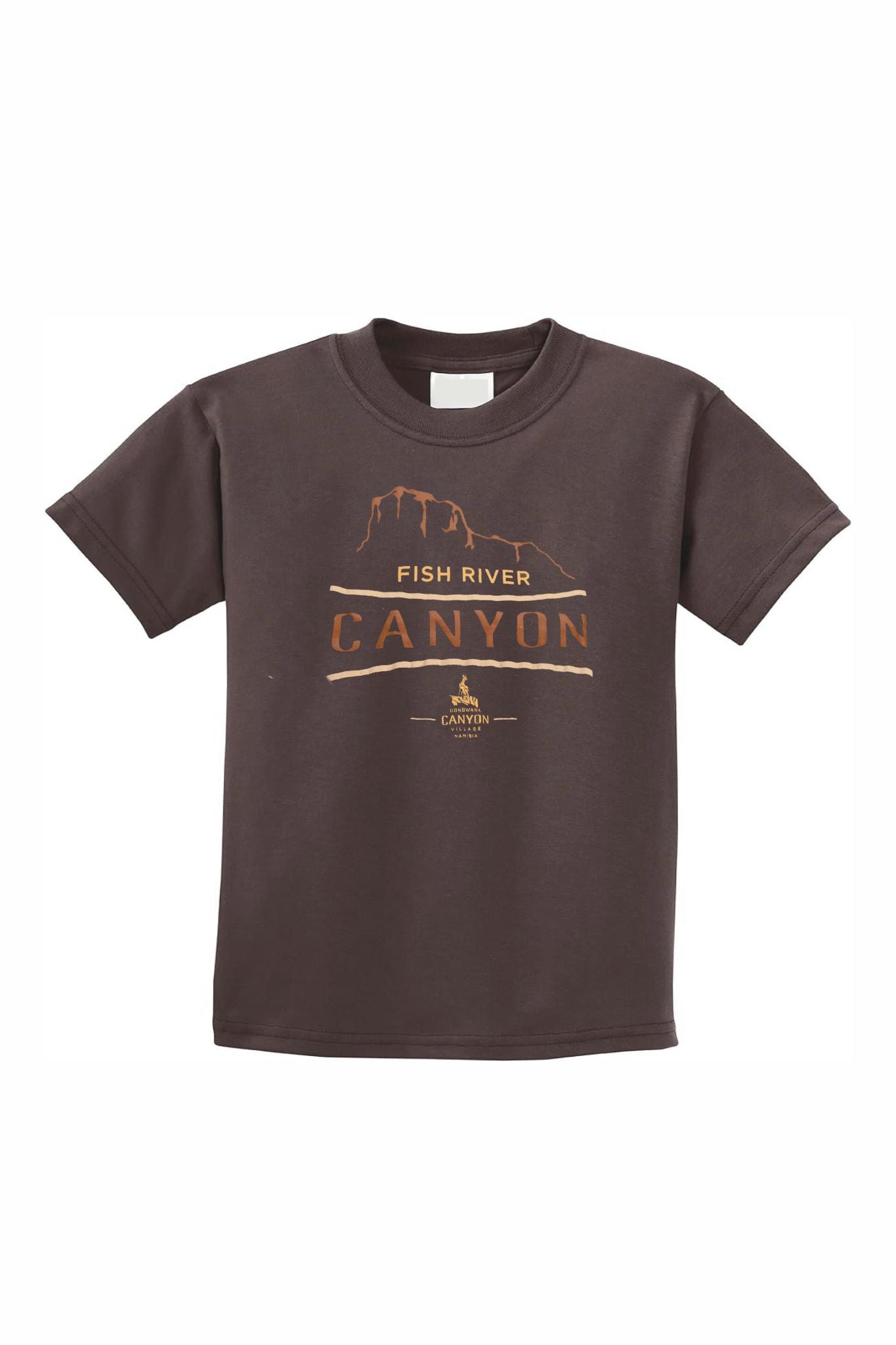 Dark olive shirt with brown mountain backdrop design and cream color Fish River canyon wording
