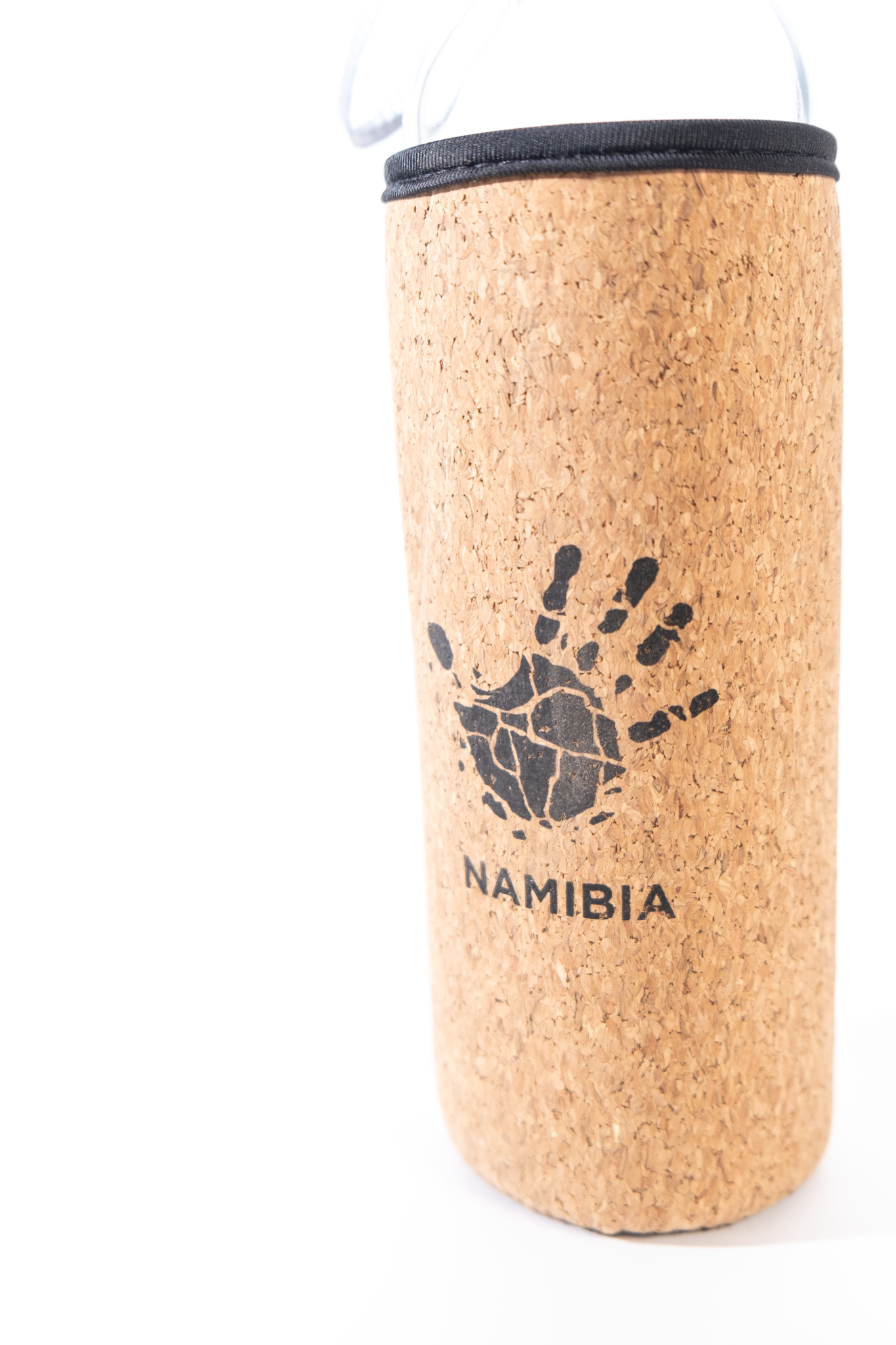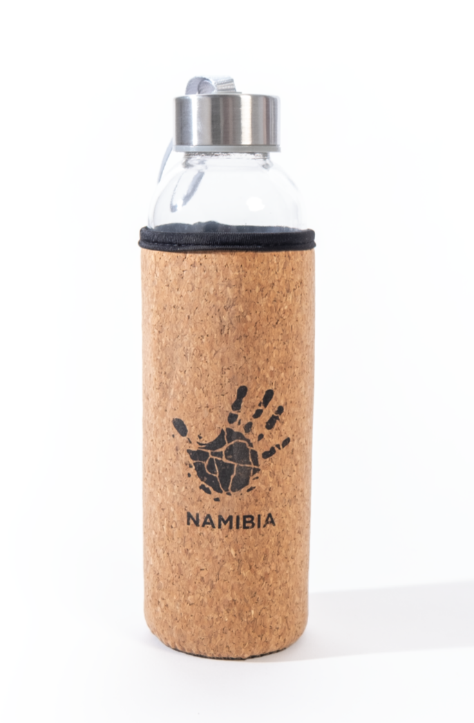 A 500 ml glass bottle with cap and handle with a cork outer sleeve and Gondwana logo print with NAMIBIA wordingÂ
