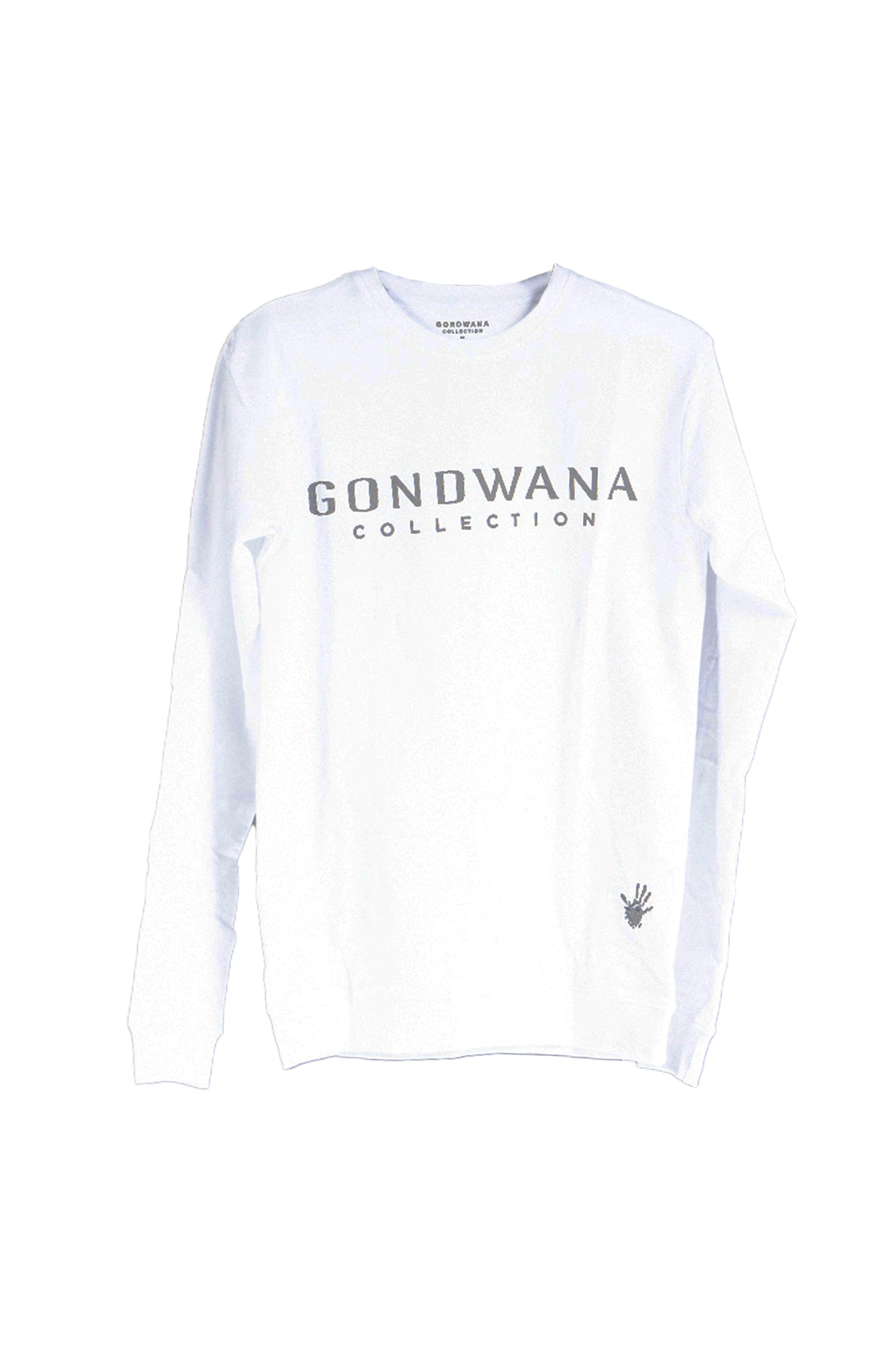 A cozy fit unisex sweater with the wording Gondwana Collection and a hand logo printed on the front.