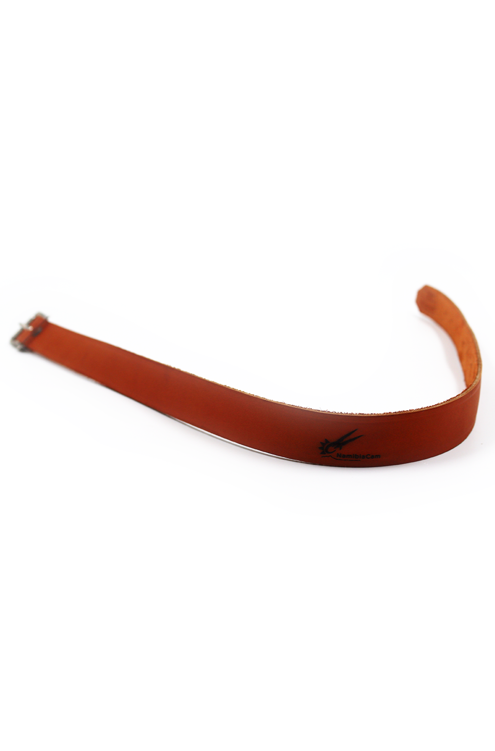 A brown belt for children made from sustainably sourced Namibian Kudu leather with metal hardware. The NamibiaCam logo is engraved on the side.