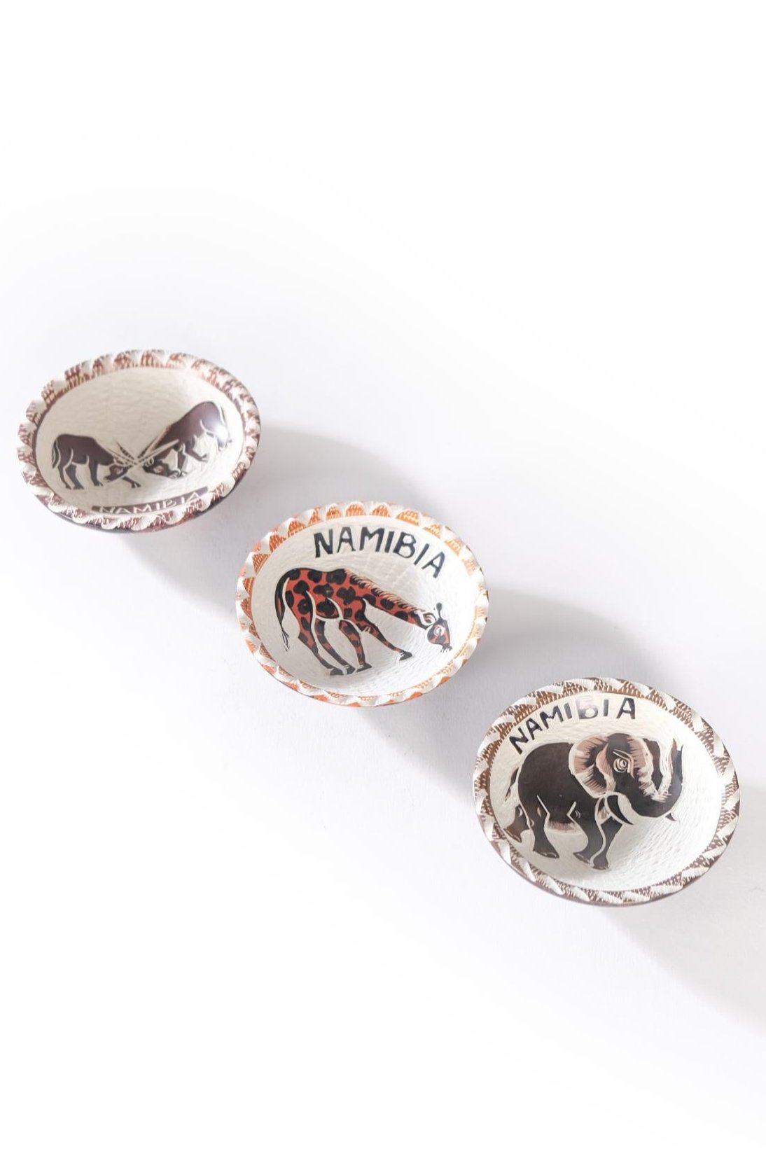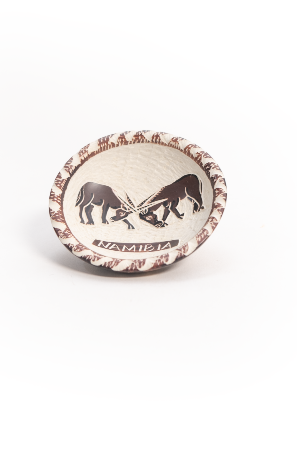 Medium sized plate made from soapstone with smooth outer area and Giraffe and/or Elephants carved on inside with the wording NAMIBIA