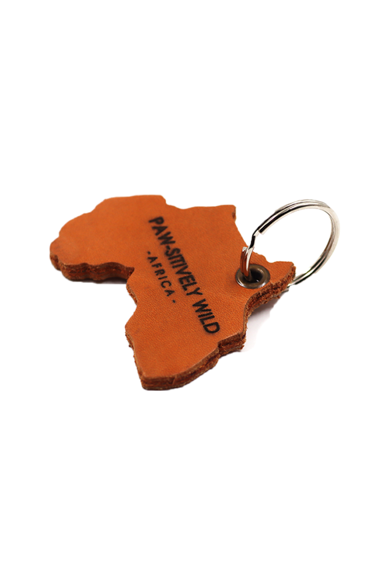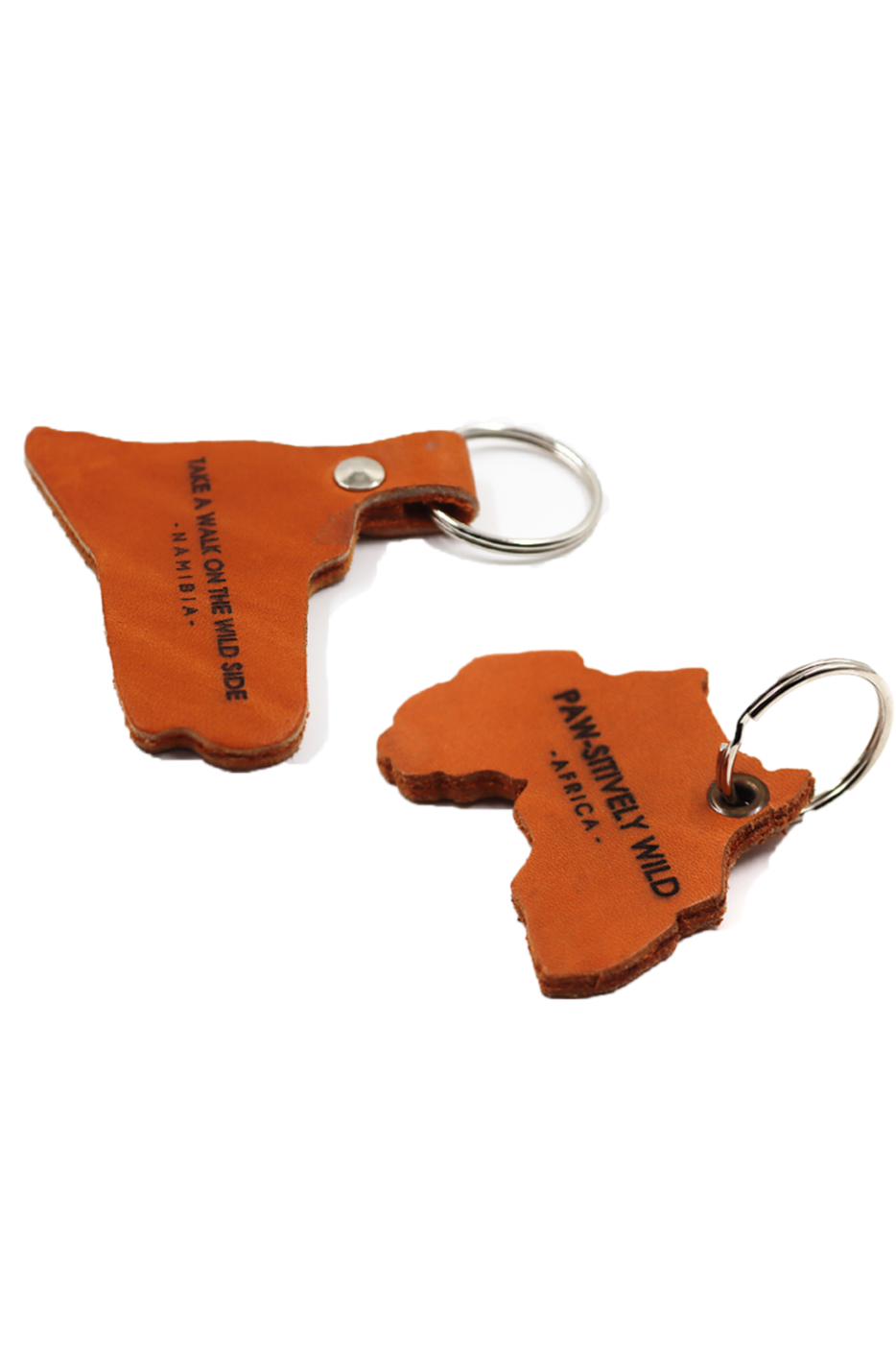 A sustainably sourced premium Kudu leather keyring in the shape of our country Namibia with metal hardware. One side sports the wording "take a walk on the wild side - Namibia"