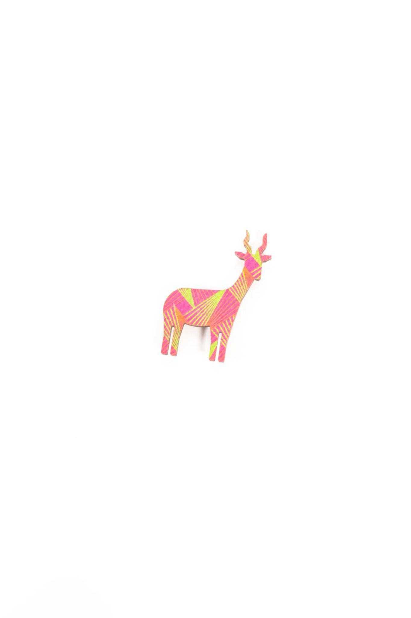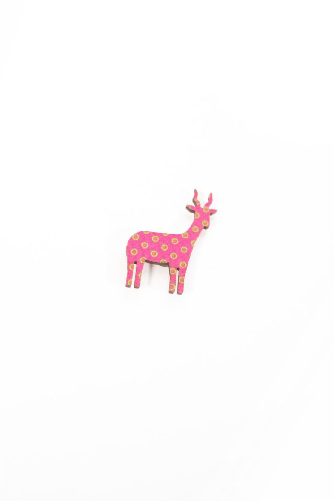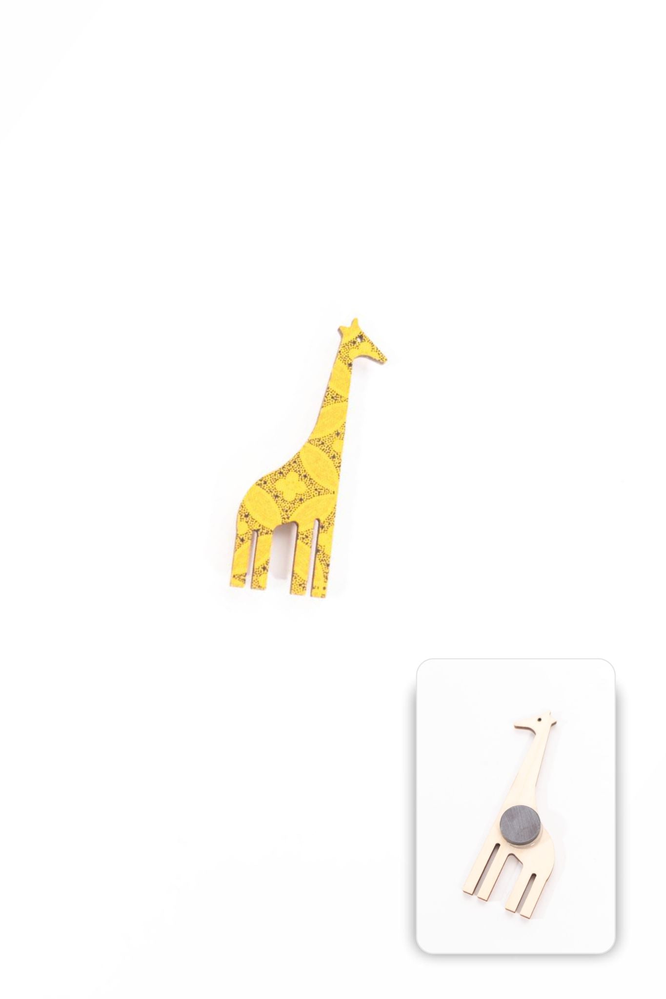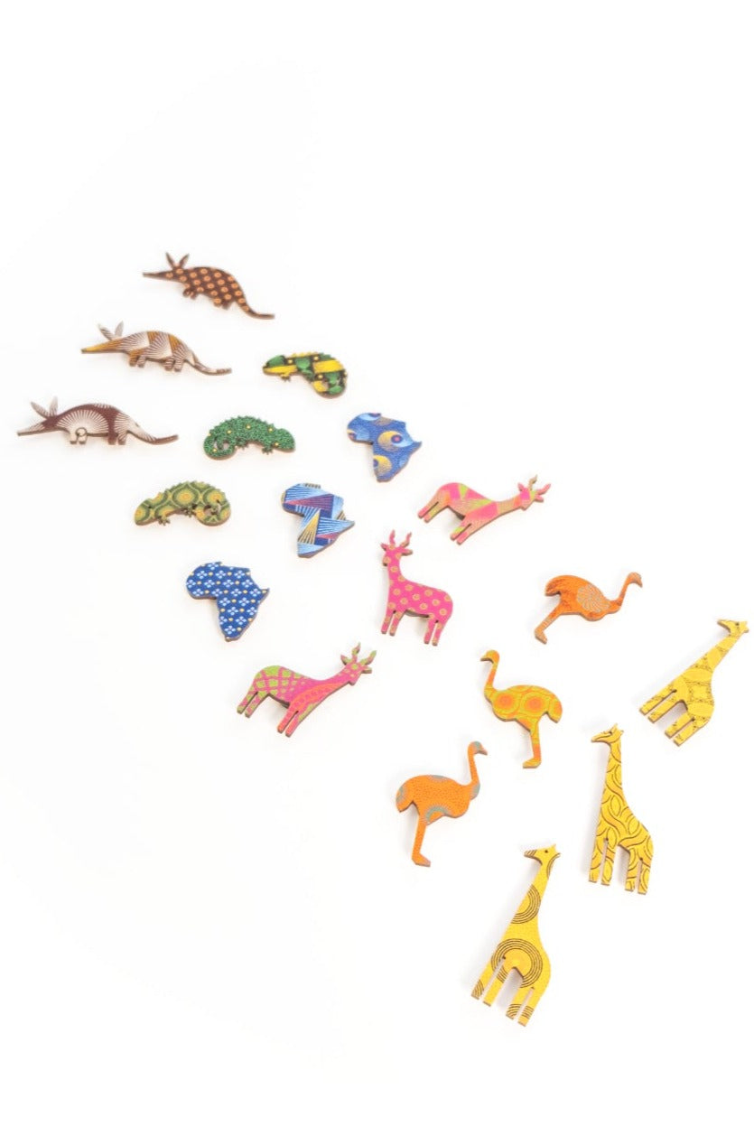 Laser-cut wooden animals clad in African Swecshwe material with a magnet on the back