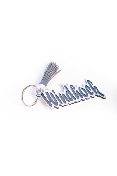 Contemporary keyrings made from aluminium and faux leather tassel with the wording "Windhoek", or the Weinberg leaf logo attached to a leather piece clasp