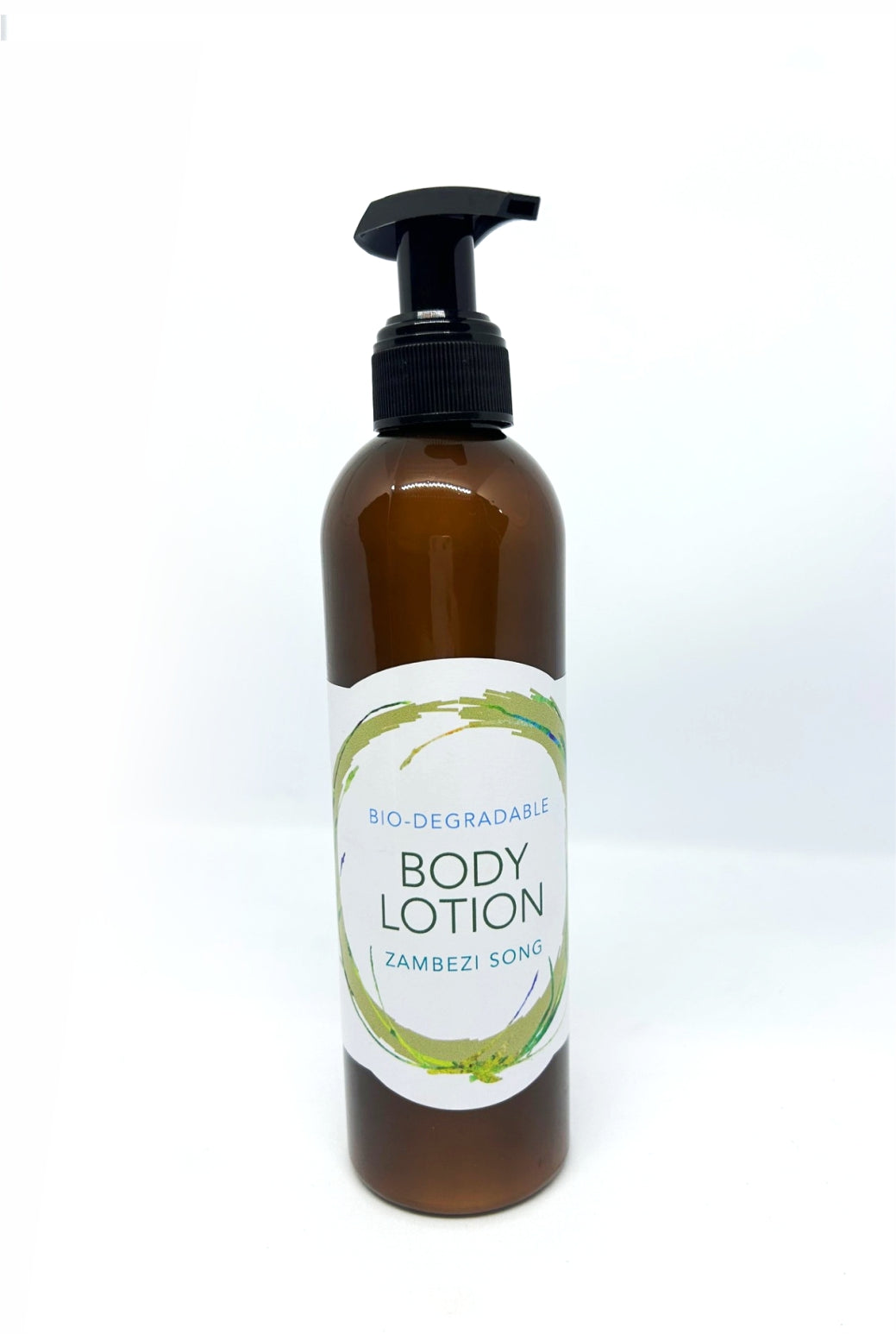 A BPA free ambercolored plastic bottle with black pump dispenser containing Body and Hand Lotion.
